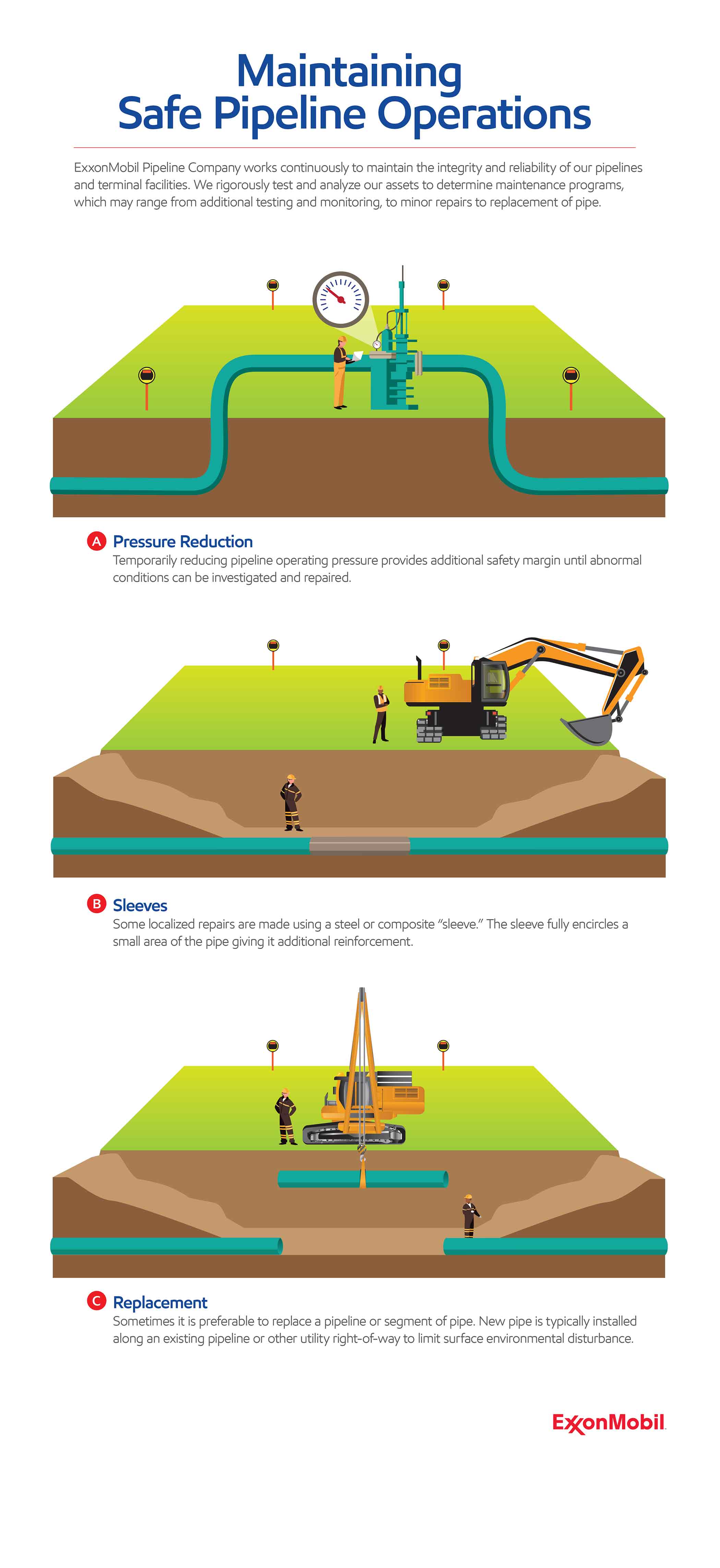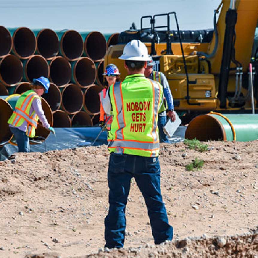 Numerous inspections are conducted during our work. Beginning with staking, through digging and the laying of pipe, we routinely inspect our operations, equipment and pipe to adhere to all safety measures. Once our pipeline is operational, the pipeline and right of way are continuously inspected to ensure we follow all applicable regulations.